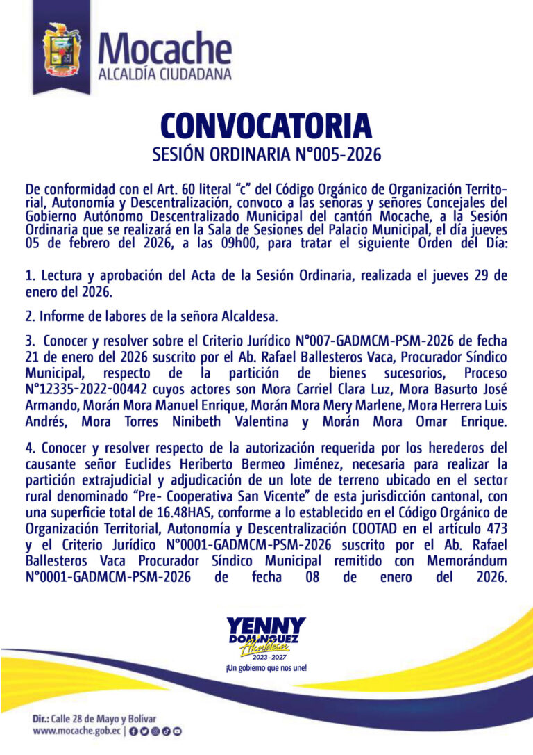 CONVOCATORIA SESIÓN ORDINARIA N°005-2026