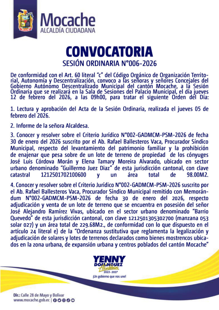 CONVOCATORIA SESIÓN ORDINARIA N°006-2026