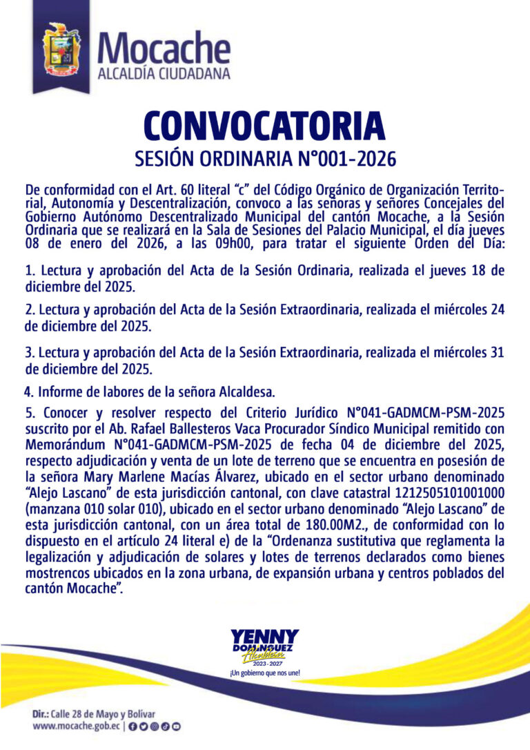 CONVOCATORIA SESIÓN ORDINARIA N°001-2026
